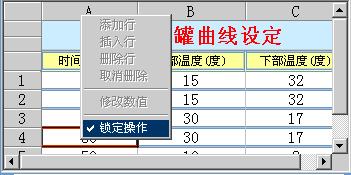 输入正确的解锁密码,点击确定。再在报格单元格上单击右键,可以进行插入行、添加行、删除行、取消删除、修改数值、锁定操作,来进行工艺曲线的设定。设定完成后,点击报表控件下方的保存按钮,所设定的曲线将显示在下面的温控曲线中。如下图所示: