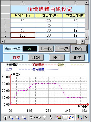 当设定曲线设定完后,如果要开始发酵或者清酒,则点击开始按钮进行温度控制。此时软件将根据设定曲线对实际温度进行控制。整个控制过程可以根据实际情况,点击自控/手控按钮进行人为的干预。在自控状态下点击此按钮,将却换到手控状态,此时,可以通过点击“上一段”、“下一段”按钮进入设定曲线的任一控制段。当选好控制段后,可点击自控/手控按钮却换到自动状态,继续执行以后的温控曲线段。如不切换,则将一直执行此控制段。